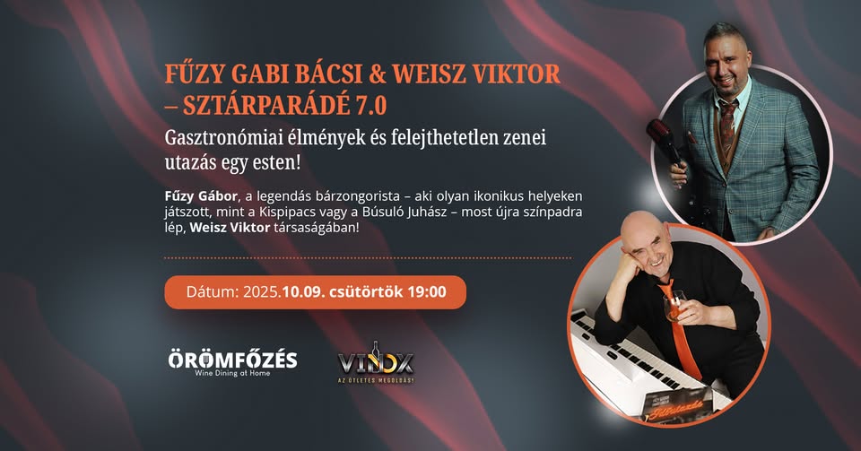 Fűzy Gabi bácsi & Weisz Viktor – Sztárparádé 7.0 Gasztronómiai élmények és felejthetetlen zenei utazás egy esten! Fűzy Gábor, a legendás bárzongorista – aki olyan ikonikus helyeken játszott, mint a Kispipacs vagy a Búsuló Juhász – most újra színpadra lép, Weisz Viktor társaságában! Időpont: 2025.10.09. csütörtök 19:00Helyszín: Book Kitchen, 1095 Budapest, Mester utca 87. Séf: […]